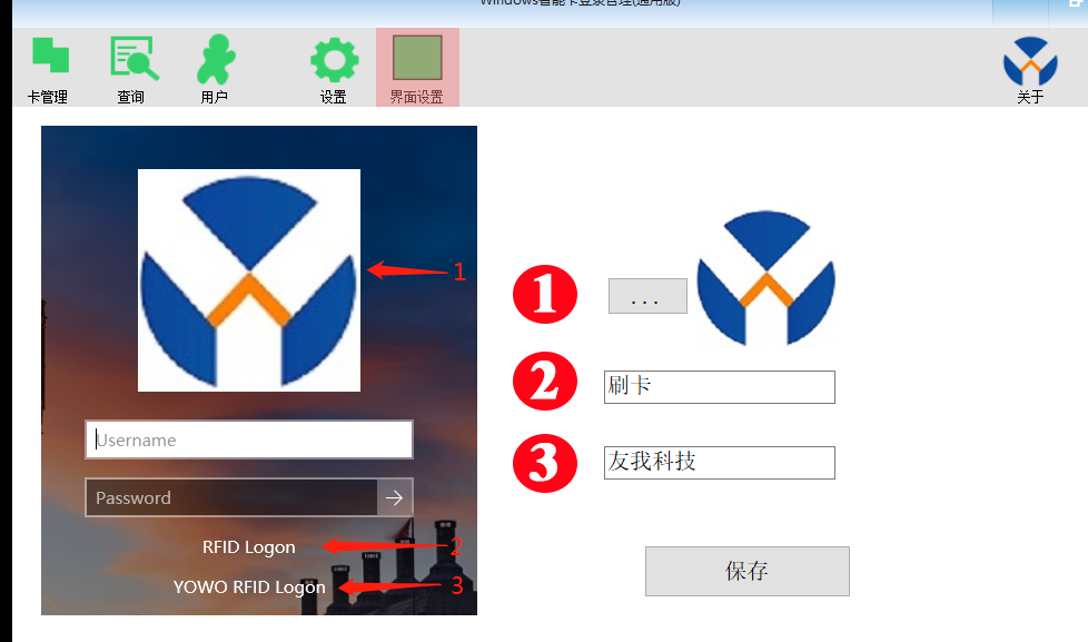點擊界面設(shè)置,可以配置登錄顯示的圖標(biāo)和對應(yīng)的文字,如果插上了讀卡器,則登錄界面不顯示用戶名和密碼輸入框。只有在沒有插入讀卡器的情況下,才會顯示用戶名和密碼輸入框