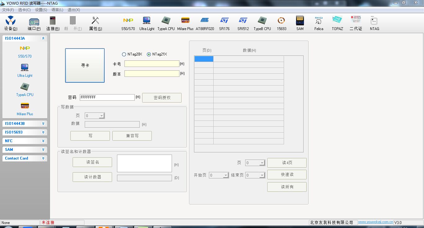NTAG讀寫器YW-607完全支持所有的NTAG的射頻接口的讀寫,關(guān)于NTAG的演示程序如下圖所示: