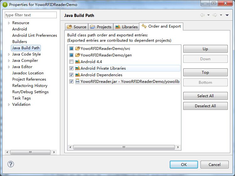 在ADT工程中導(dǎo)入yoworfidreader.jar庫文件,即可在工程中引用NFC讀寫器的類文件