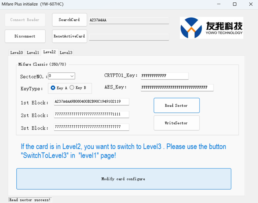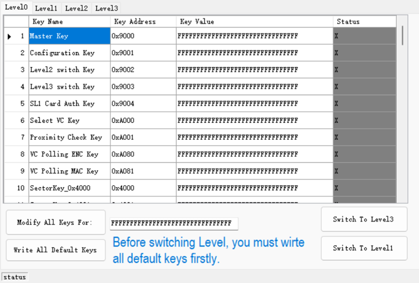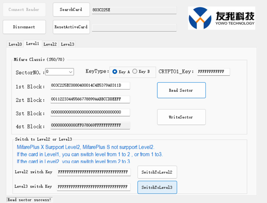 Switch TO Level1: 將卡片切換到LEVEL1, 在執(zhí)行該功能前,需先寫入默認密鑰