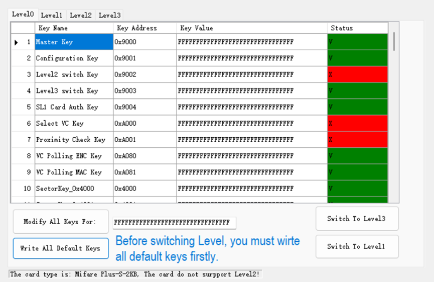 Write All Default Key: 將列表框中的密鑰寫入到卡片中,列表框Status欄位顯示綠色,表示該地址密鑰寫入成功,若為紅色表示該列表框密鑰寫入失敗,失敗原因可能是該卡不支持該地址密鑰,假如所有密鑰都寫 入失敗則可能是該卡不是MIFARE PLUS卡片,或者MIFARE PLUS 卡片已經(jīng)不在LEVEL0層級,在我們執(zhí)行SWITCH之前必須先執(zhí)行完該按鈕功能.