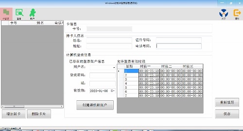 每張IC卡可以配置時(shí)間段,超出時(shí)間段不能登陸,如果已經(jīng)登錄,超出時(shí)間段則會(huì)按照設(shè)定的方式鎖屏、注銷或者關(guān)機(jī)。
