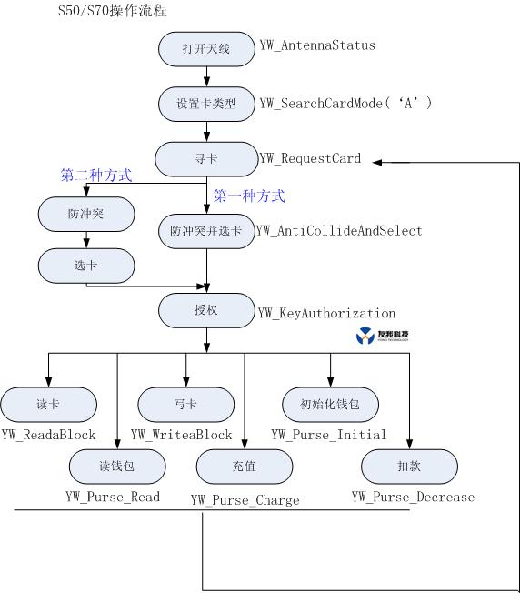 YW605在所有卡操作之前必須打開天線,讀完卡后可關(guān)閉天線,也可以不關(guān)閉天線。對卡的操作流程如下圖所示: